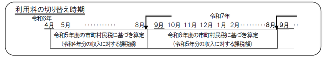 利用料については、下図のとおり、毎年9月に利用料の切り替えを行い、その年の9月から翌年8月の利用料を算定することとなっております。そのため、年度途中で利用料が変更となる場合があります。